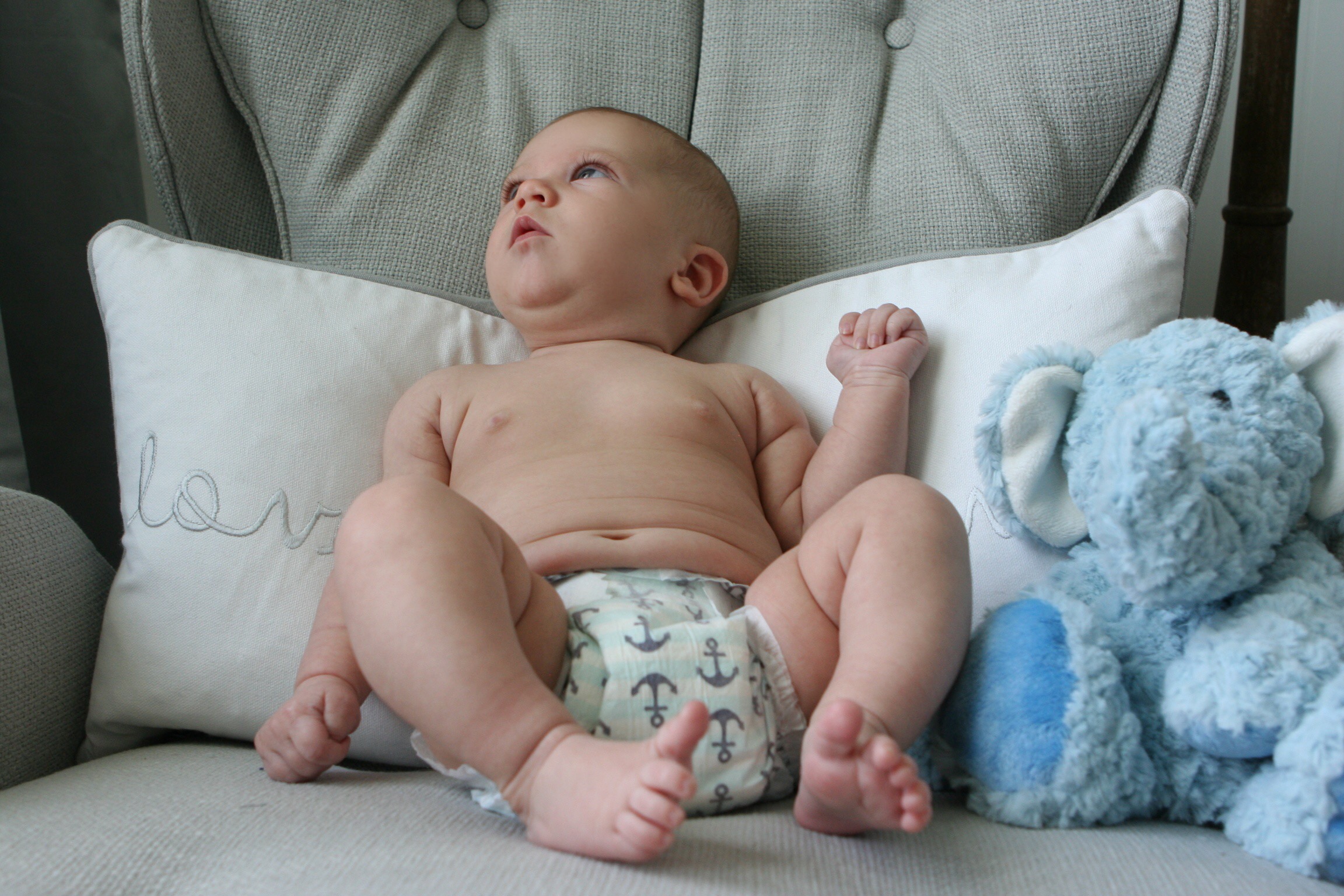 This little stinker… gosh, he’s the BEST! He can go from completely content to unbelievably tragic in a split second. Ha ha ha! Today we had our two month check up with the pediatrician, and she confirmed what we already knew… He’s perfect! ;) His length did not change but he has gained about 1.5 pounds. He had 3 vaccinations, 2 of which he took like a champ. The 3rd… well, that one had a heartbreaking reaction from him, but as soon as it was over he was over it and moving on to the next thing… milk! He’s still a breast milk only baby, enjoying every drop I have to offer. Unfortunately, his acceptance of bottles has made a drastic turn for the worse. He refuses to accept from anyone at all… We will continue to work on this, but in the meantime, I’m still tethered to my lil man.